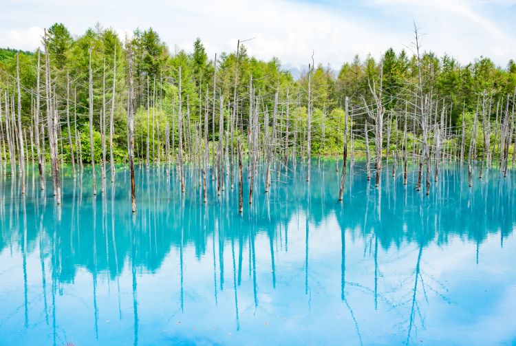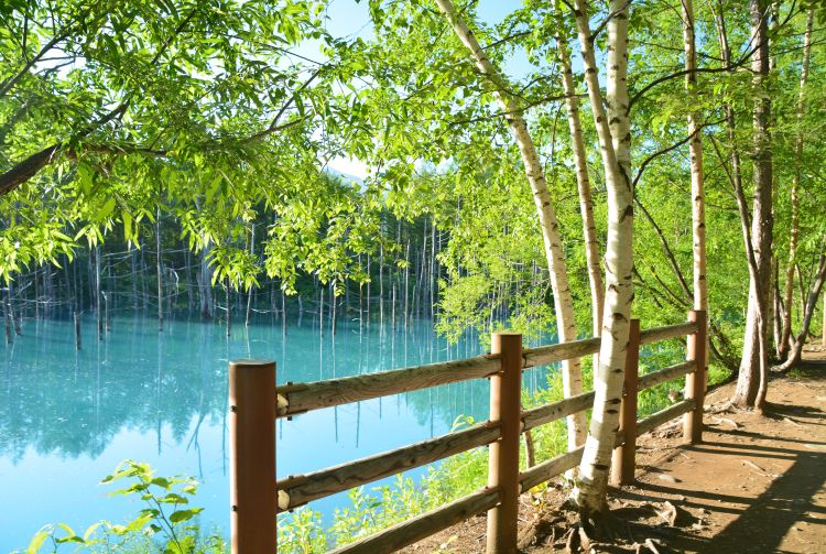 青池是个令人惊喜的意外。这座池塘位于美瑛町附近。当年十胜岳喷发时,人们为防止泥石流侵害而筑起堤坝,却意外形成了一座池塘。池水来自白须瀑布,瀑布中的杂质让池水呈现出明亮的蓝绿色、翠绿色和钴蓝色等各种色彩。它的模样还会随着四季更迭以及风雨云朵的变幻而改变。