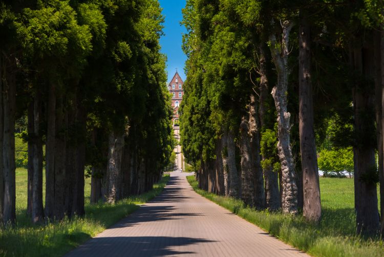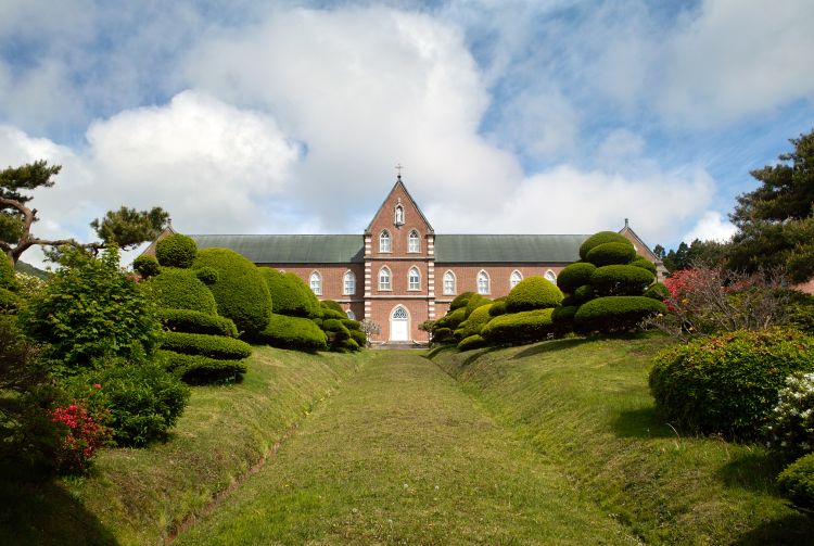 当别特拉普派修道院为红砖式建筑,与周围绿意盎然的环境形成了极美丽的鲜明对比