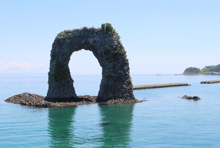 奥尻岛最广为人知的景致是风化海蚀形成的花岗岩拱门,其外型如同矗立于海面的巨大甜甜圈。19.5 米高的锅钓岩位于奥尻岛东岸。入夜之后,灯光打在岩石之上,营造出魔幻般的效果,同样非常值得参观。