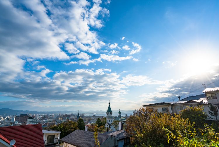 元町共有 19 条坡道。其中风景最好的是八幡坂。您可以在有轨电车的末广町站下车,再往上步行一小段路就能到达。