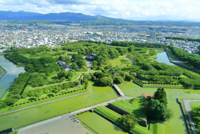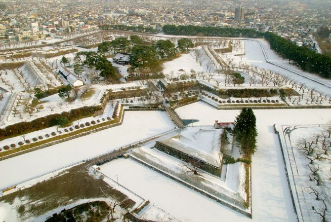 五棱郭位于函馆的正中心。五棱郭得名于这座军事堡垒的五角星造型,因此其又被称为"星堡"。由武田斐三郎操刀设计的五棱郭,由于深受法国军事工程师沃邦的影响,成为了日本的第一座西式堡垒。五棱郭于 1864 年完工。