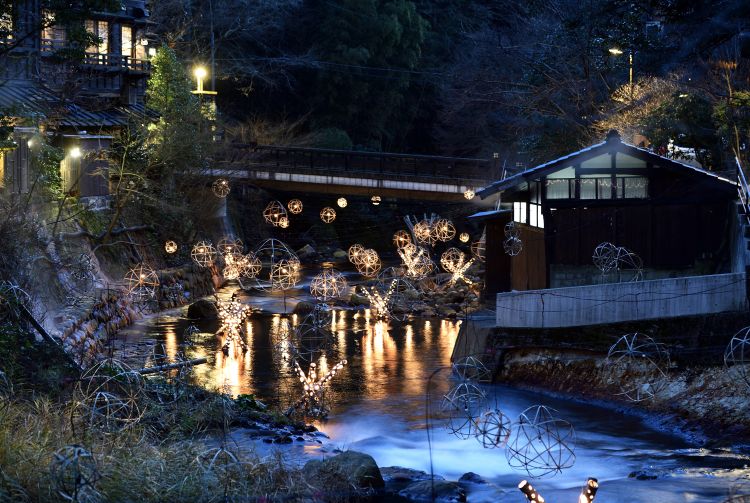 黑川意为"黑色的河",是一座风景如画的小镇,提供约 30 种泡汤选择。黑川是九州保存最为完好的温泉小镇之一,坐落于海拔 700 米高的山上,王泷川流经其中。户外的露天风吕也十分受欢迎,您可以一边泡汤,一边欣赏森林美景,聆听河水潺潺。