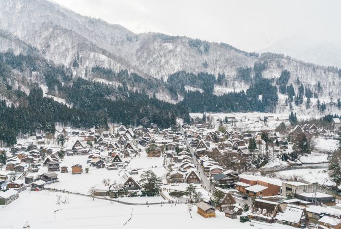 合掌造村庄会让您感觉回到了现代前的日本。登上白山瞭望台,眺望村庄,感受已逝去的时光。