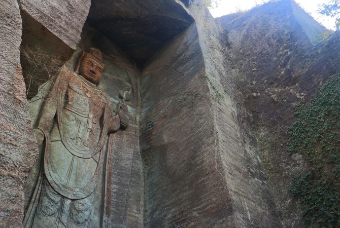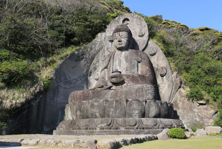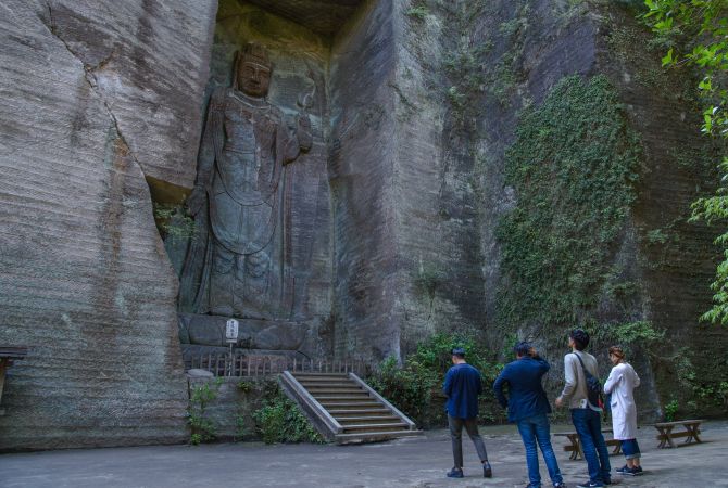 锯山一侧山体的花岗岩上有一尊巨型石刻佛像。佛像高 31 米,是日本最大的佛像之一,甚至比高德院著名的镰仓大佛还要大。这尊佛像是为祈求世界和平而塑,大部分雕刻于 1783 年完成。