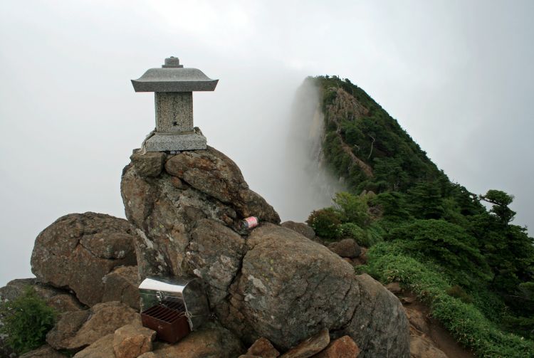 沿着往山顶的方向,小径变得陡峭起来,您可以攀爬一些近乎垂直的峭壁,有巨大的铁链固定在悬崖上。这些是为喜爱冒险之人准备的,而阶梯则提供了一个较为容易的选择。到达山顶后,您可以沿着山脊从土小屋走向突起的顶峰。在这里,您将会看到石锤山脉的绝妙景色,还有濑户内海和晴空下的九州。