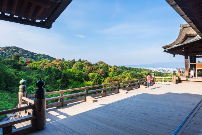 清水寺的露台在主殿,是清水寺最著名的特色景点。这座露台采用传统日式木质结构,高出地面 13 米,整个构造没有用到一根钉子。