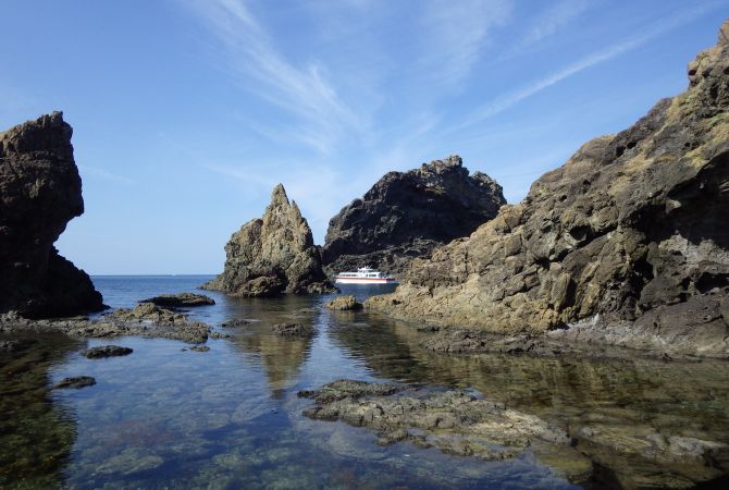 在西之岛,您可以在国贺海岸欣赏其天然拱门和自然雕琢的岩层。附近的摩天崖海拔 257 米,是日本最高的悬崖之一,观景游船是欣赏其美景的最佳途径。另外,您也不要错过陷落火山口的内火山锥:烧火山。一座古老的神社坐落在山坡上,在山顶上可看到四面八方的美景。