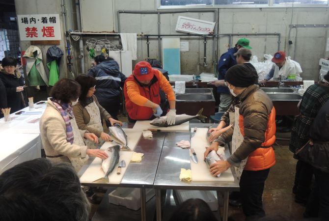 除了以优惠的价格贩卖海鲜,现场也会展示片鱼的方法,还有介绍各类海鲜营养价值的传单。有些时候,鱼市甚至会提供烹饪课程。