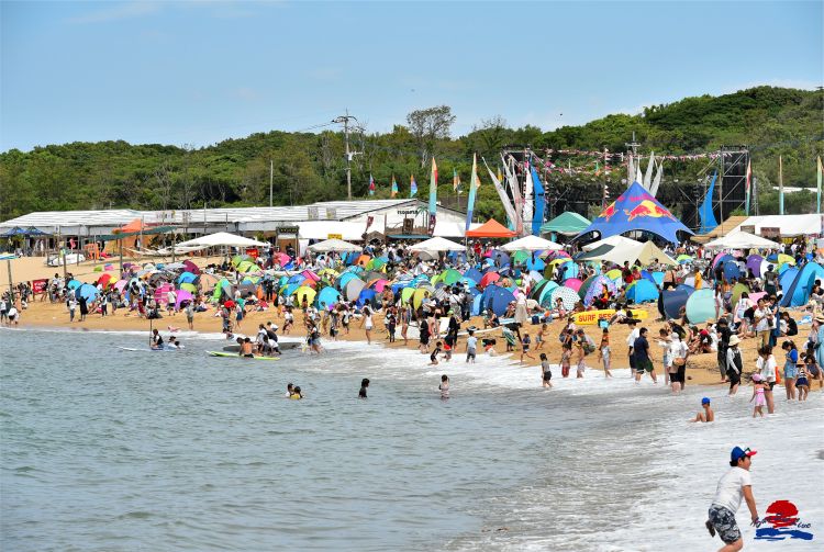 Sunset Live 音乐节的会场,选在狭长的芥屋金黄色沙滩,一边邻海,另一边则有蓊郁青葱山林,环绕音乐节会场。