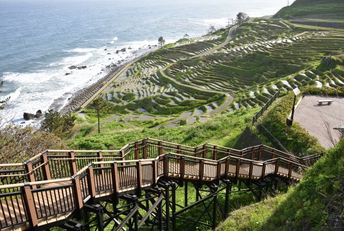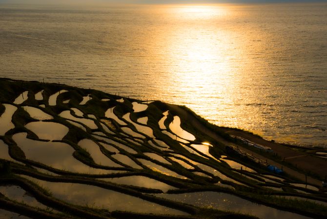 白米千枚田位于风景优美的山坡上,是水稻梯田。这些独特的稻田坐落在能登半岛,是国家指定的"风景名胜"。