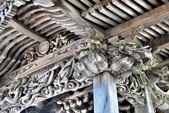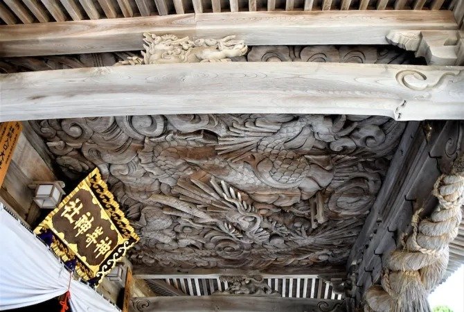 神崎神社供奉着神道教海神须佐之男。据说这位神灵打败了威胁邻近的出云省的大蛇——八岐大蛇。本堂内有许多精美的雕刻,包括天花板上一条长达 16 米的巨龙,蔚为壮观。