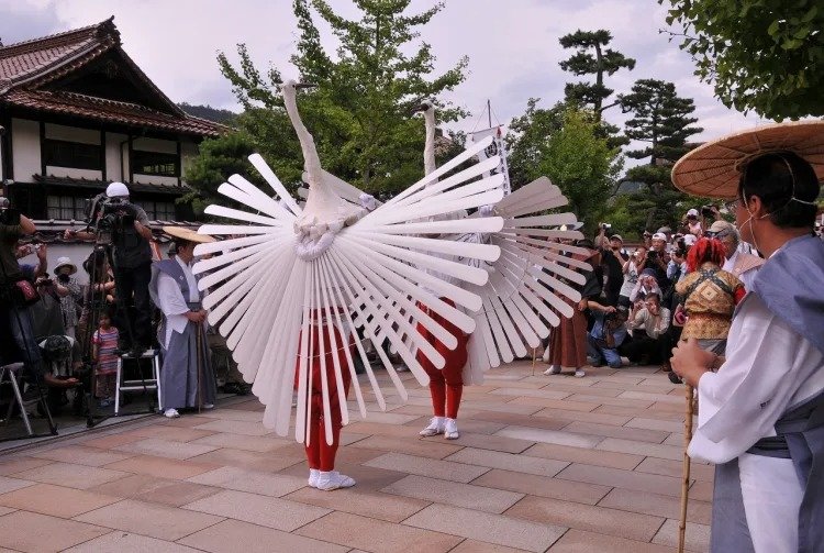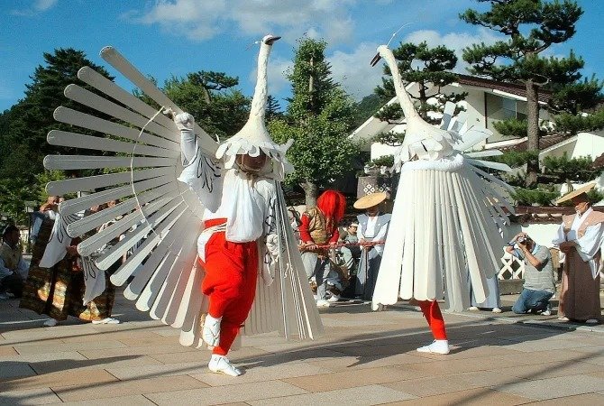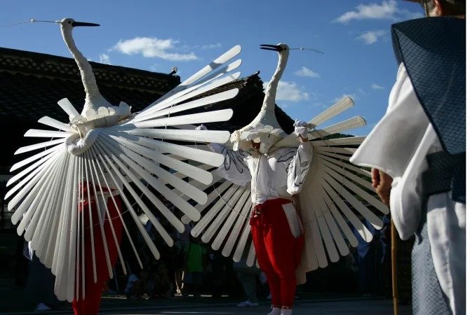 两名白鹭舞者的翅膀由木制的 39 根羽毛组成,长颈的头饰相当引人注目。每个人都会穿着当代的服装,还有人扛着高大的"雨伞",上面托着鸟和鸟巢。切莫错过最近祭典增加的项目"雏鸡舞",由一群年轻的女学生以游行形式表演。