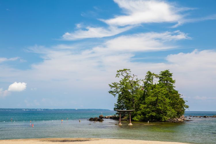 弁天岛坐落于一处静谧的海湾上。前方有一座小型鸟居矗立于水上,映照出迷人的景色。
