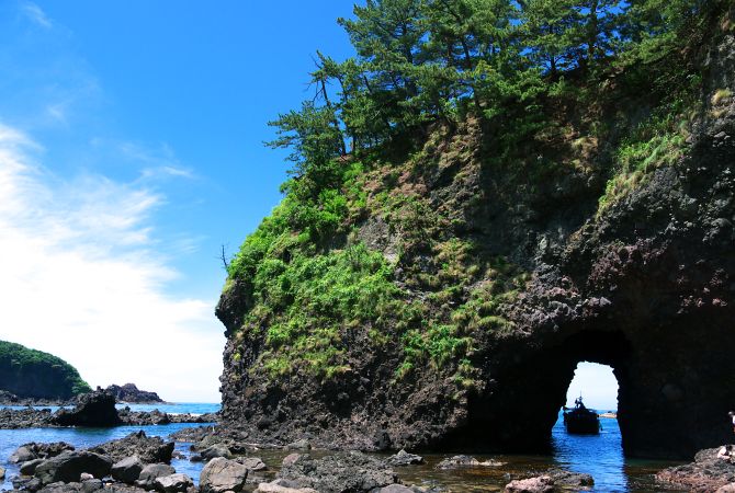 沿着日本海的崎岖海岸线,您会发现严门和其他独特的岩石造型。这些岩石和海岸线附近区域展现了独一无二的壮观自然美景。