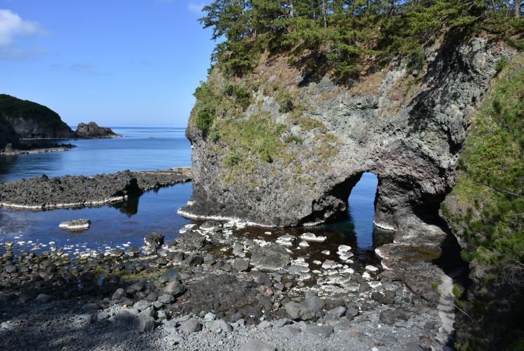 能登半岛西海岸的日本海特别崎岖不平,形成了陡峭起伏的海岸线。巨大的悬崖从水中耸立而出,中央因侵蚀而形成一个大洞,看起来就像一扇门。