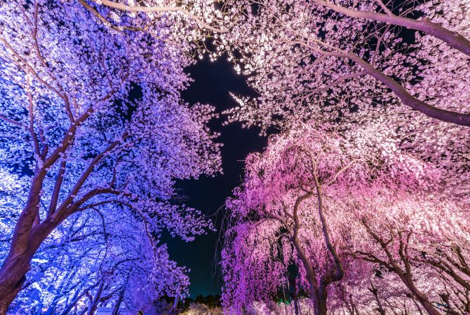 打上彩色灯光,展现不一样的樱花美景