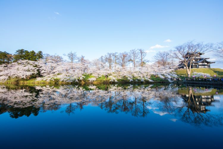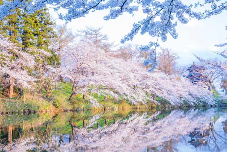 高田公园的中央矗立着重建后的高田城三层角楼,曾归德川家康第六子所有。欣赏映照在平静的护城河面,樱花倒影的缤纷色彩。