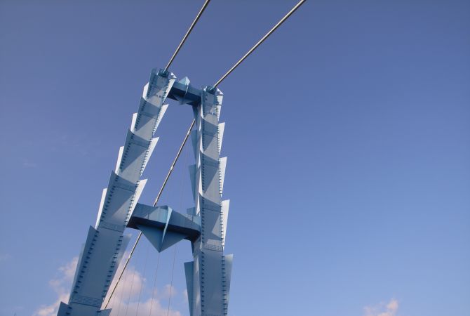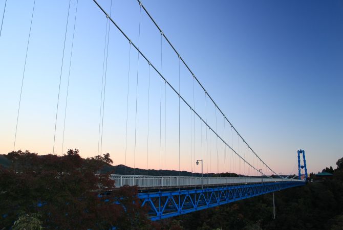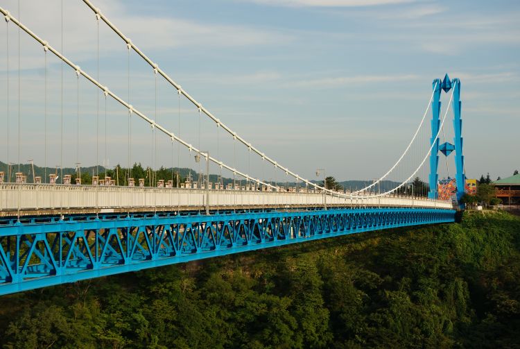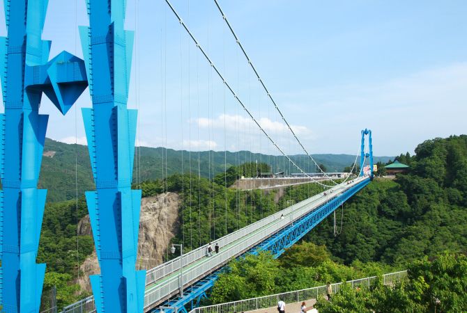 茨城县的龙神大吊桥提供独一无二、惊险刺激的体验。站在 100 米的高处,低头可见深邃的峡谷和迷雾缭绕的龙神湖。放眼望去,处处都是绿意盎然的茂密森林与山丘,头顶则是一望无际的天空。