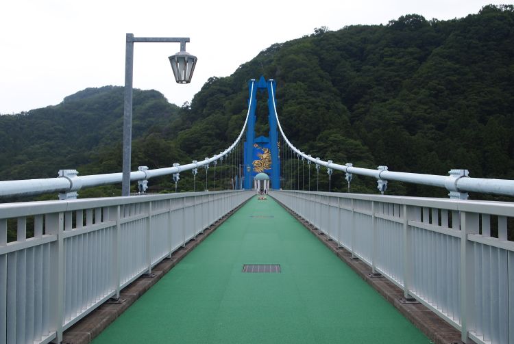 从吊桥上看到的景致十分壮观。吊桥横跨龙神湖,即因龙神川水坝工程而形成的龙形湖。吊桥的壁面亦绘制了龙的图像。
