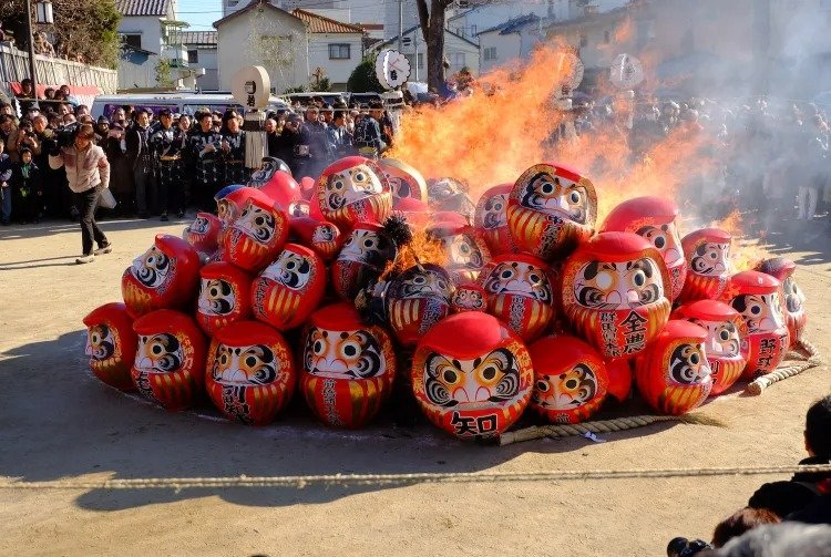 初市祭从上午 10 点开始,开幕就是烧掉前一年的达摩像。接下来前往八幡宫欣赏感恩营火,象征把幸运符送回天堂。