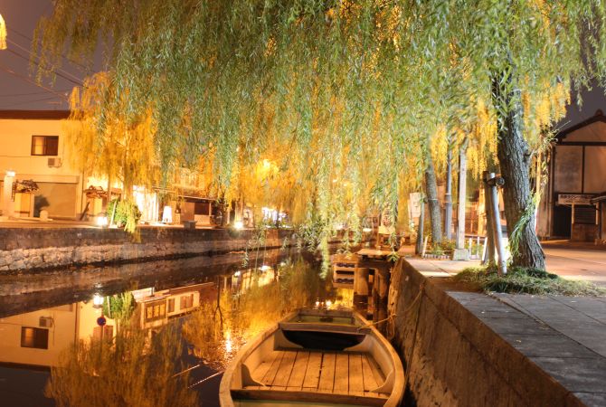 船夫用竹竿撑着又长又窄的小船在运河中前进,一边介绍这个城镇伟大的历史,一边吟唱当地诗人北原白秋创作的诗歌。