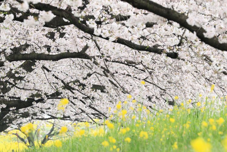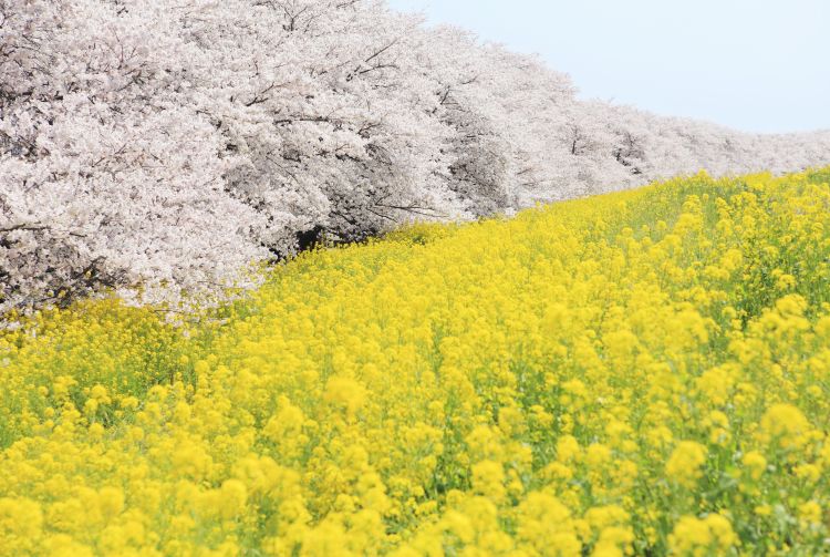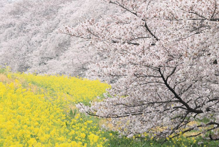 熊谷樱堤的 2 公里长荒川河岸,种植了 约 500 棵樱花树。樱花树与油菜花同时绽放。开花时呈现出美妙的色彩对比:树上是紫色、粉红色和白色,树下是亮黄色。