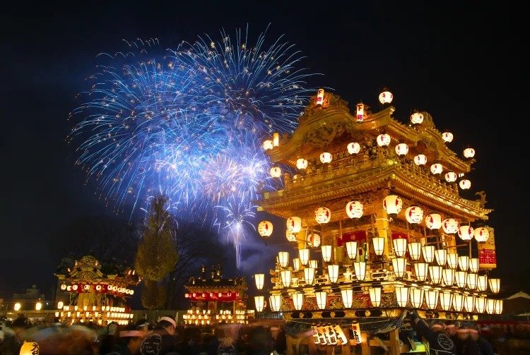 埼玉县的秩父夜祭是有至少 350 年历史的夜间祭典,每年 12 月 2 日至 3 日举办,是关东地区规模最大的祭典之一。该祭典有设计华丽的六座超大型屋台,重达 10 到 20 吨。人们在笛鼓交织的音乐中拉着屋台穿过秩父的主要街道,吸引大批热情的人潮前来观赏狂欢。