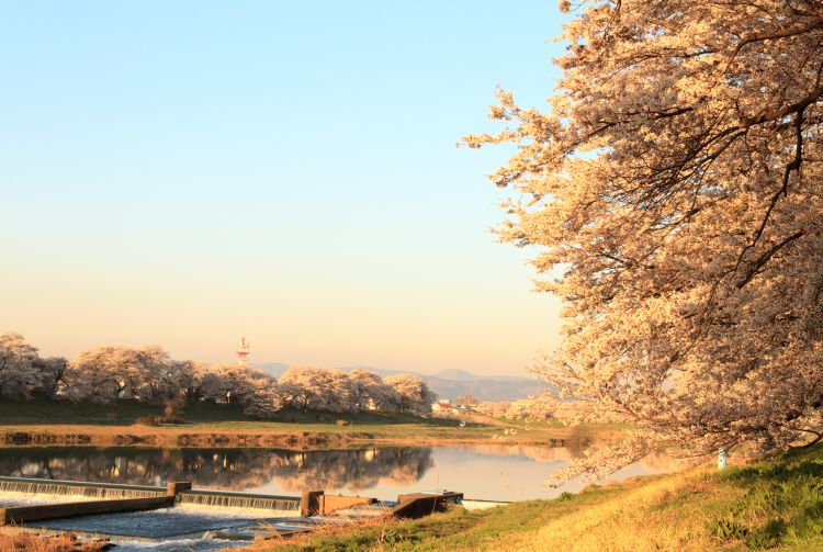 在长达 8 公里的河岸两旁,种有 1200 株樱花树。樱花树的种类繁多,有白山樱、重瓣樱和日本最常见、漫山遍野的吉野樱。此处三分之一的吉野樱树龄超过 90 年,因此每一株樱花树均呈现不同样貌。