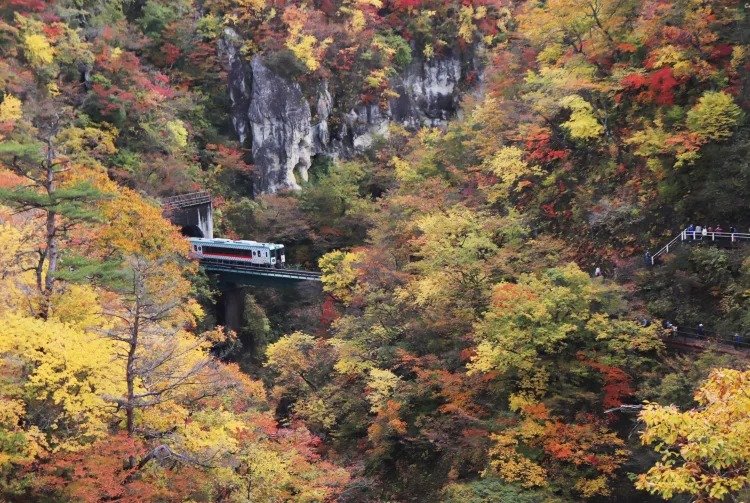 从十月下旬到十一月初,山坡会逐渐转变为明亮的橙色、金黄色和深红色,可此时前往观赏无与伦比的美景。从鸣子峡旅社 (Narukokyo Resthouse) 出发,前往邻近的观景台,观赏大深泽桥的壮丽美景。