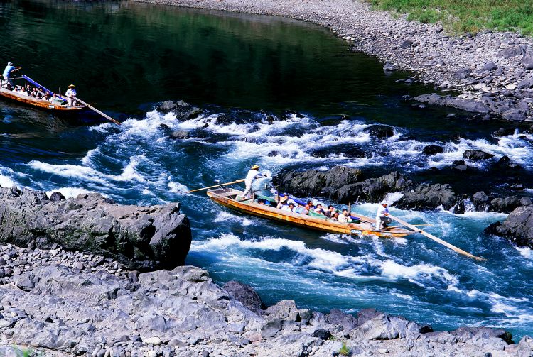 当您乘船游览球磨川时,有许多不同的游船路线可供您选择,有的平稳缓和,有的则是湍急惊险。