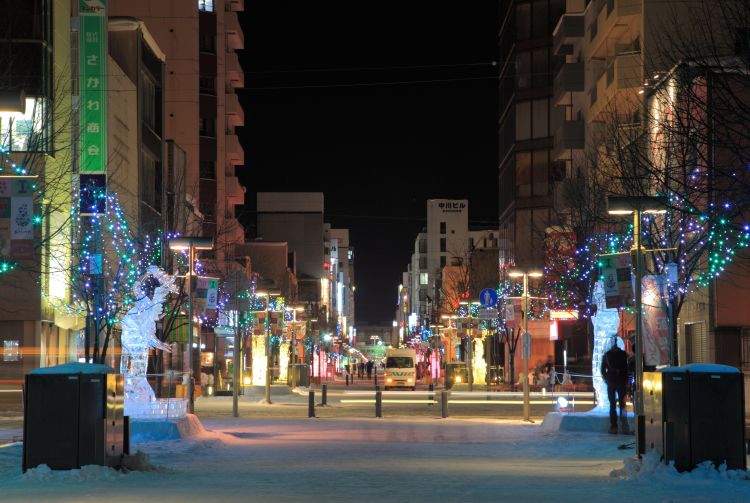 平和通是穿过市中心的主要街道,沿街可欣赏 50 尊令人惊叹的冰雕,在旭川冬祭的前几天,还能观赏冰雕大师工作的过程。入夜之后,这些冰雕就会笼罩在奇幻的灯光中。