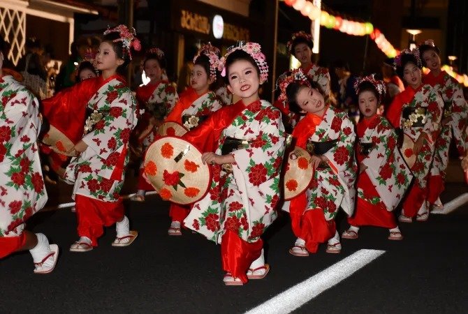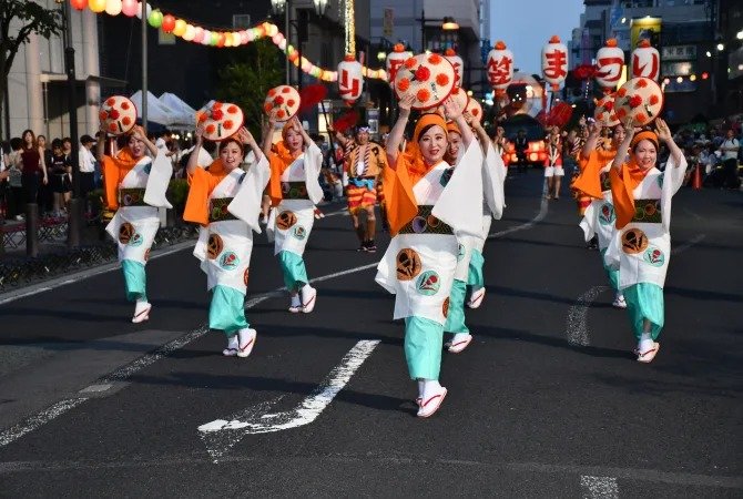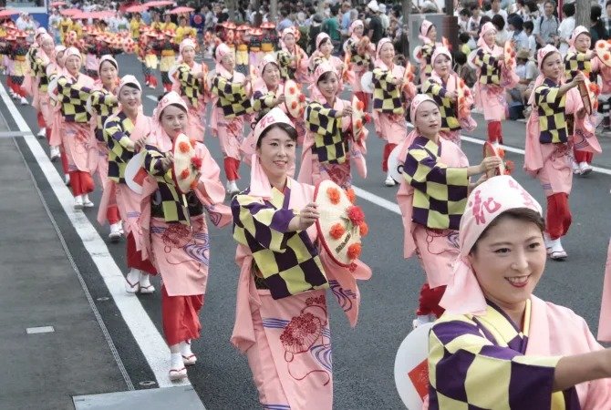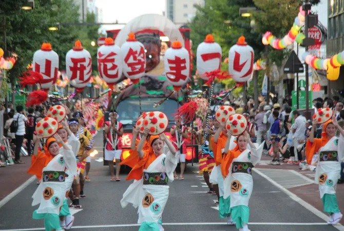 舞者面对着山形的旧市政厅文翔馆,随着民歌的节奏舞动,并在"Yassho, Makasho"的歌词鞭策下在街上前进。