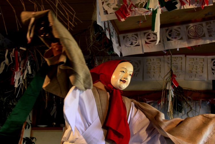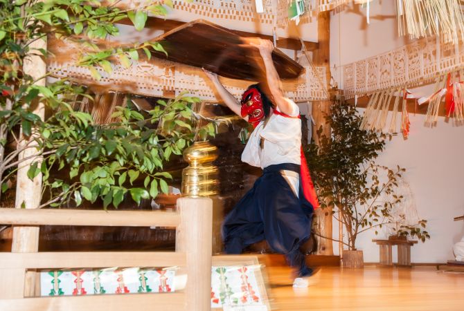 每年时逢十一月底,九州宫崎县的高千穗便会举行夜神乐,通宵达旦地举办舞蹈表演、说书、打鼓,民众戴着象征各尊神明的面具登场表演,欢庆这项拥有 800 年历史的传统仪式。表演述说日本历史的起源,颇具娱乐性质,而且内容精彩丰富。高千穗的夜神乐被指定为国家重要非物质民俗文化遗产。