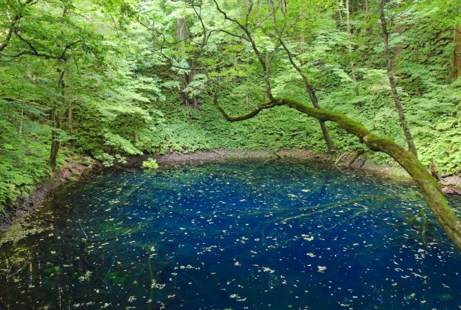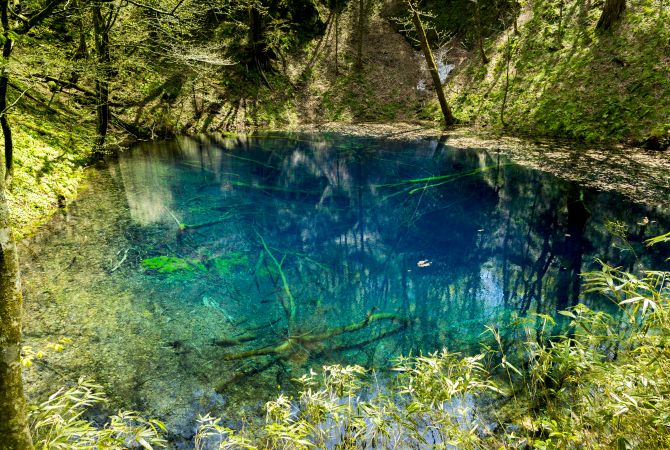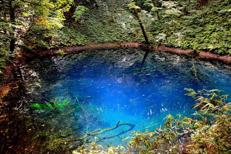 青池(蓝色池塘)的池水翠蓝清澈,很容易就能看见沉到将近 10 米之深的池底中的树枝。