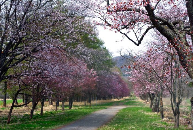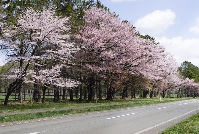 周围绿地青翠,远处是令人赞叹的日高山脉,漫步于二十间道路樱花大道,欣赏落英缤纷的樱花美景。