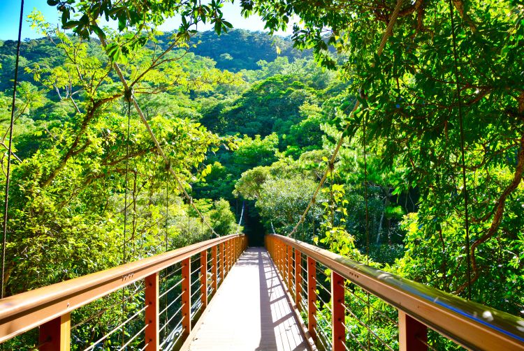 冲绳北部的野生动植物比南部更加丰富多元。一路上随时可能会出现各种鸟类、乌龟、蛇、蜥蜴等。此处最令人难忘的是一座木质吊桥,这座吊桥横跨在布满绿树、深达 17 米的小山谷之上。