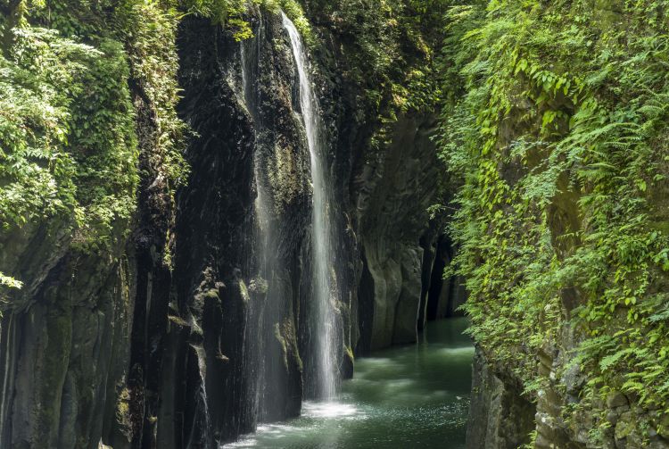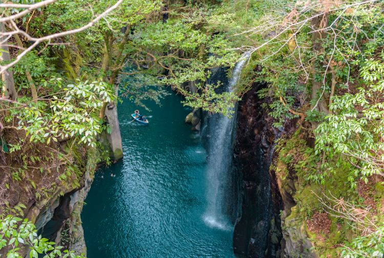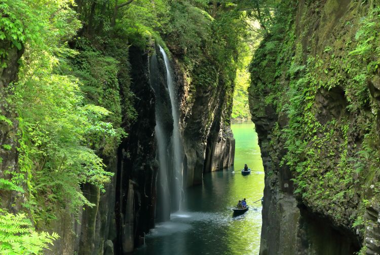 游览九州时造访宫崎县的高千穗峡,就可以欣赏到如此动人的风光。高千穗峡是一个柱状节理峡谷,因古代熔岩流快速冷却而形成。泛舟于峡谷之间,仰望真名井瀑布从 17 米高处飞流直下,品味令人赞叹的自然之美。
