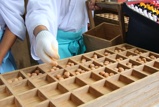 在出口附近有一小排摊位,摊位上摆放着一些小盒装的石子。买一些石子并对其许愿,然后尽力将石子扔到悬崖下的小坑中。