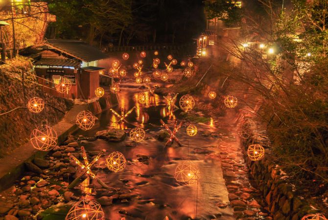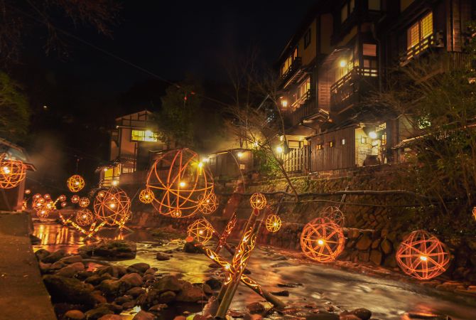 熊本有丰富的天然温泉资源,但很少有像黑川温泉那样出名。这个山城大约有 30 家温泉旅馆,让您有机会体验地道的日本文化。在这里,您可以尽情欣赏自然风光,享受温泉,品尝包含多道菜品的怀石料理,还可以在舒适的榻榻米客房内休息。