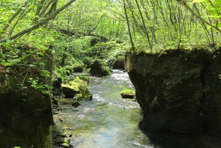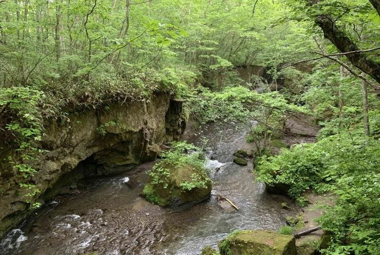 在樽前河缓慢流动的河水周围耸立着覆满青绿色苔藓的陡峭山壁。