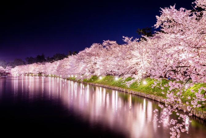 在弘前樱花祭期间,夜晚的点灯活动是一大亮点