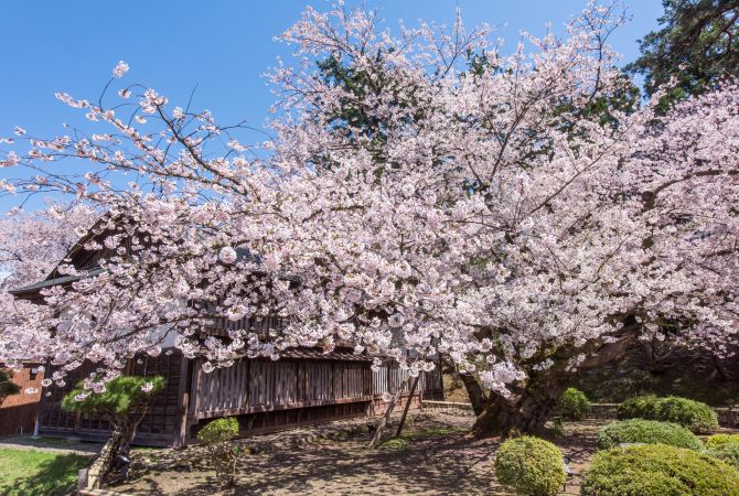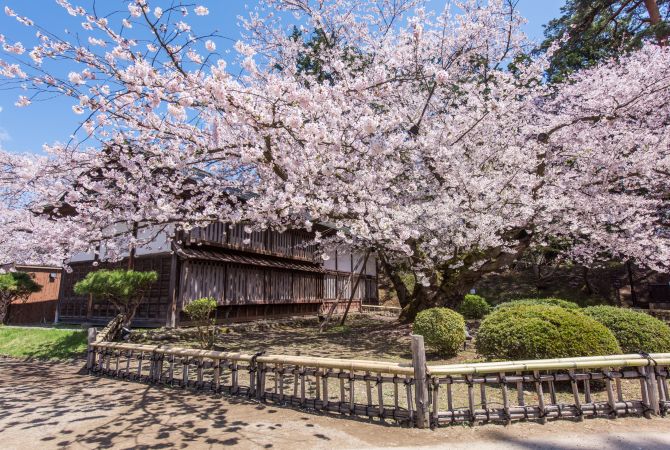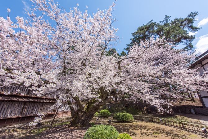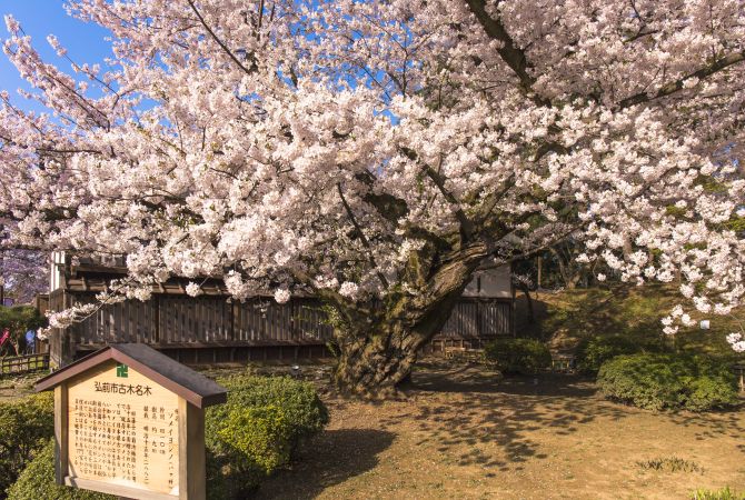 弘前公园内知名的染井吉野樱种在内护城河区域,即弘前城的位置,距离市役所前站约 10 分钟步行路程,距离东内门最近。