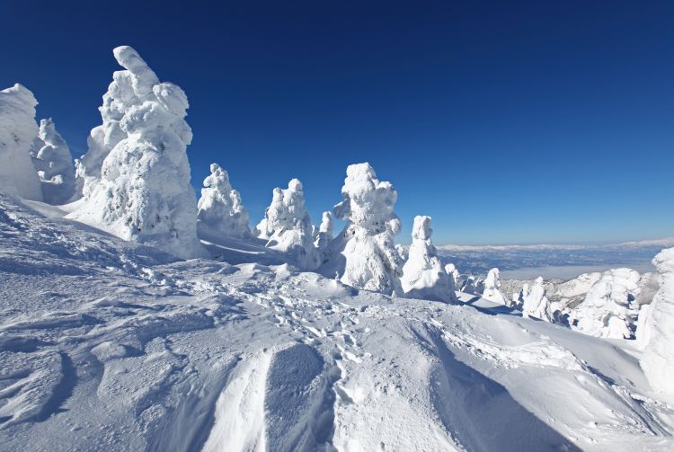 藏王山的峰顶藏有吓人的雪怪,称为"树冰",其实是西伯利亚寒流与大雪共同造就的产物。