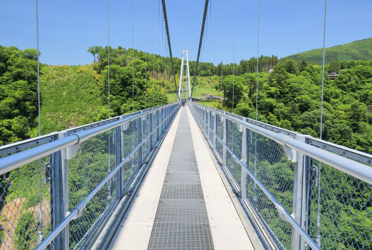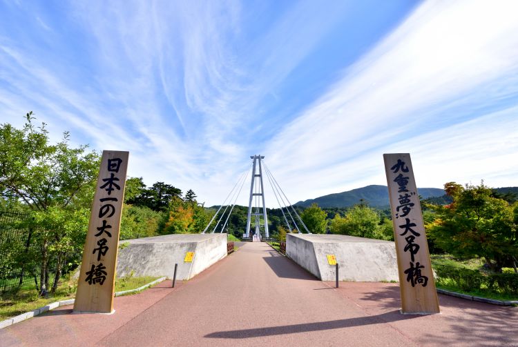 穿过大分县西部的九重梦大吊桥就如同在天上行走一般。它是日本最长最高的人行天桥,站在上面能够饱览大分绿意盎然的乡村风光,看到两座瀑布、鸣子川和下方 173 米深的山谷。