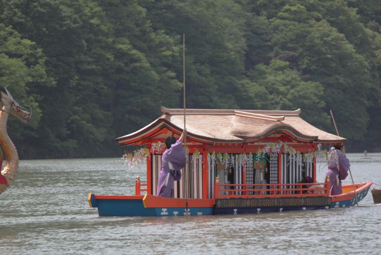 五月在京都岚山区举行的三船祭是非常迷人的年度祭典,再现天皇与朝廷举行皇家游船宴会的历史。