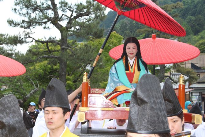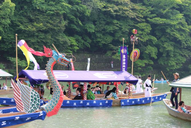 中午在神社举行过仪式后,穿着古代服装的人们就会走过岚山渡月桥,登上小船。