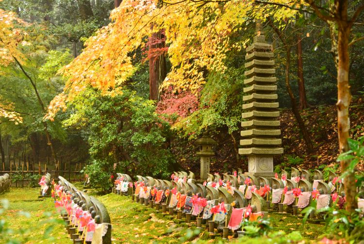 寺庙各处点缀着数以百计的地藏菩萨雕像。在佛教中,这座菩萨是儿童(包括未出生的婴儿)、旅行者和消防员的守护者。信徒们也以独特的方式悉心呵护着金刚轮寺的地藏菩萨雕像。