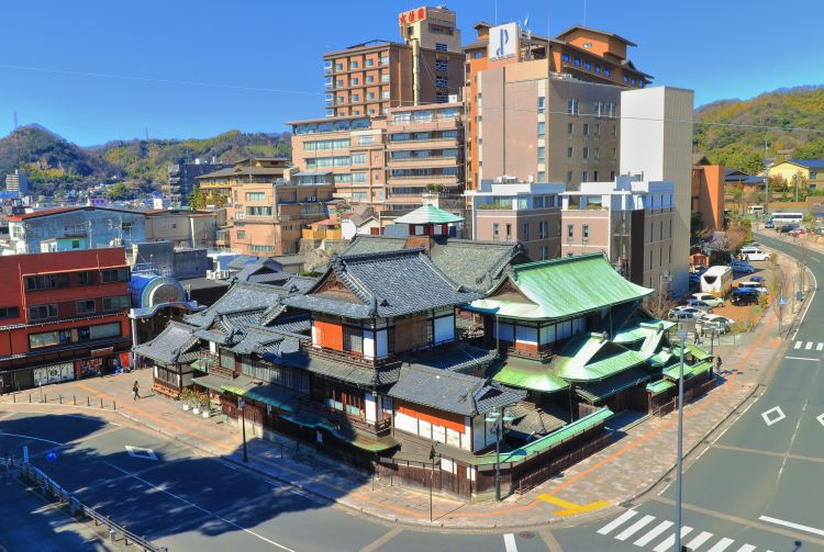 道后温泉位于松山的主要旅游中心,沿着繁华的购物商场,从道后温泉电车站步行 5 分钟即可到达。