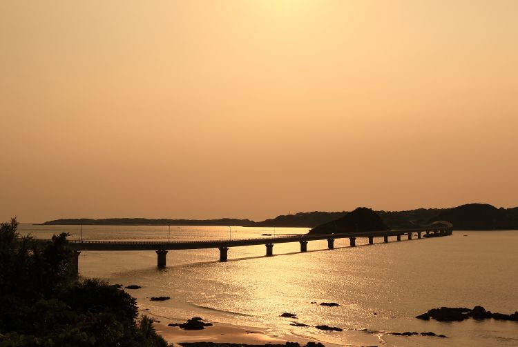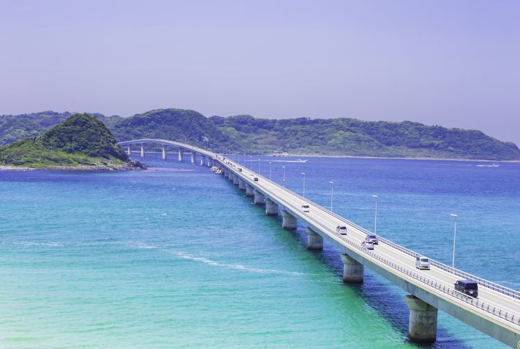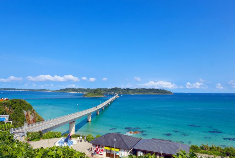 角岛大桥位于山口县西北海岸的日本海附近,曾与周边的迷人风光频频亮相于电视广告之中,只需一眼您就能明白缘何如此。明媚阳光、蔚蓝海面和漂浮在地平线上的小岛,浪漫而宁静的氛围正是众多游客梦寐以求的。