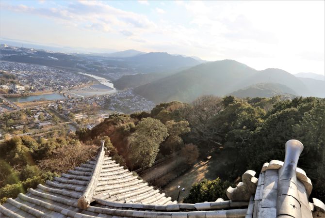 从吉香公园搭乘缆车,上升 200 米即可到达岩国城。这段车程大约 3 分钟,您可以欣赏城下町的风景。